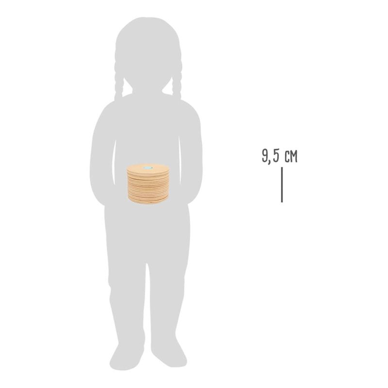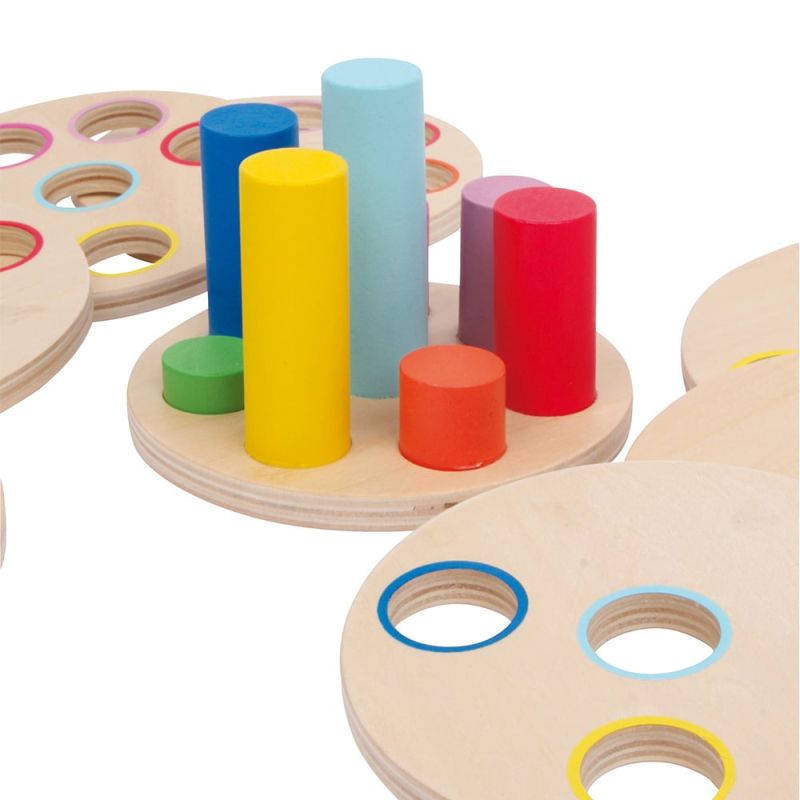 Пъзелът за нанизване е атрактивен и тренира фините двигателни умения у децата! Целта е да поставите всички плочи по подходящ начин на цветните пръчки. Но това е по-лесно да се каже, отколкото да се направи, защото всяка пръчка е с различна височина.8 здрави диска (с дебелина 1 cm), изработени от фин шперплат.