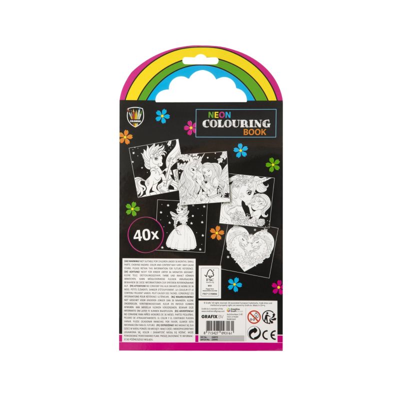 Книжката за оцветяване съдържа 40 листа с изображения на еднорози и 5 неонови маркера.