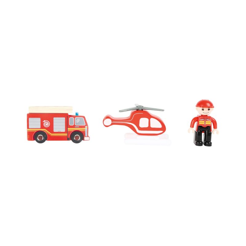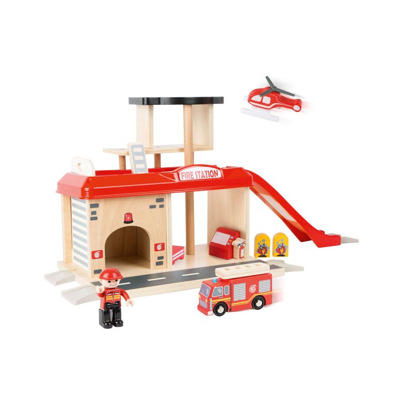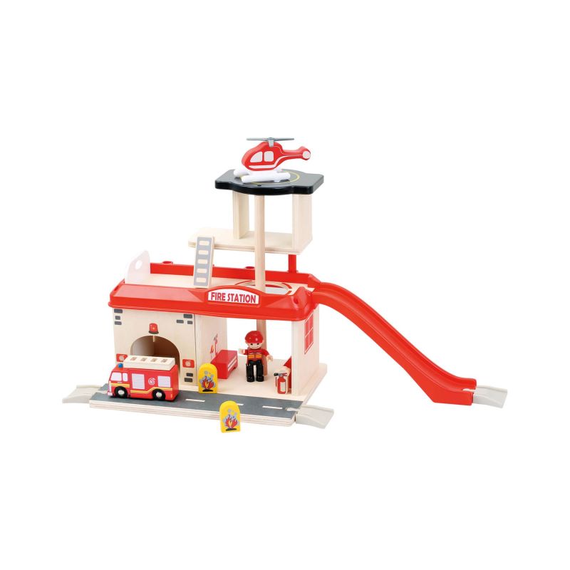 Внимание, имаме спешно обаждане! Тази пожарна станция със сигурност ще донесе истинско забавление по време на игра. Този комплект, изработен от FSC® 100% сертифицирано дърво и пластмаса, разполага с много аксесоари, като пързалка, хеликоптер, пожарникари, пожарогасител и пожарна кола и позволява на младите пожарникари да се впуснат в приключението. Когато получите спешно повикване се плъзнете надолу по пожарния стълб или пързалката, отворете гаража и карайте с пожарната кола възможно най-бързо до мястото на пожара! Хеликоптерът също е готов за действие. Пожарната станция е чудесна играчка за момчета и момичета и гарантирано ще осигури дълги часове забавление в детската стая.