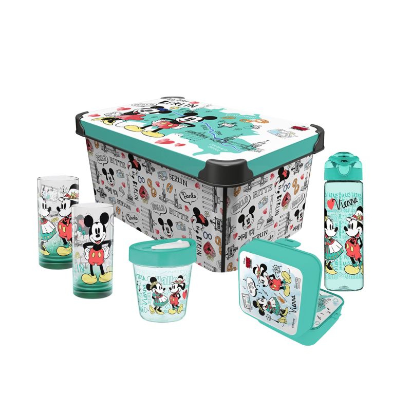 Disney Комплект Travel, кутия за съхранение 10 L, кутия 1 L, чаша за пътуване 350 ml, бутилка за пътуване 630 ml, 2 стъклени чаши 300 ml, зелени