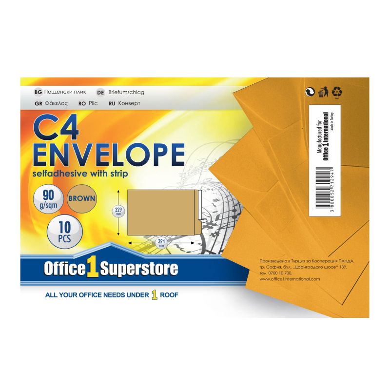 Office 1 Плик, C4, 229 x 324 mm, хартиен, със самозалепваща лента, кафяв, 10 броя