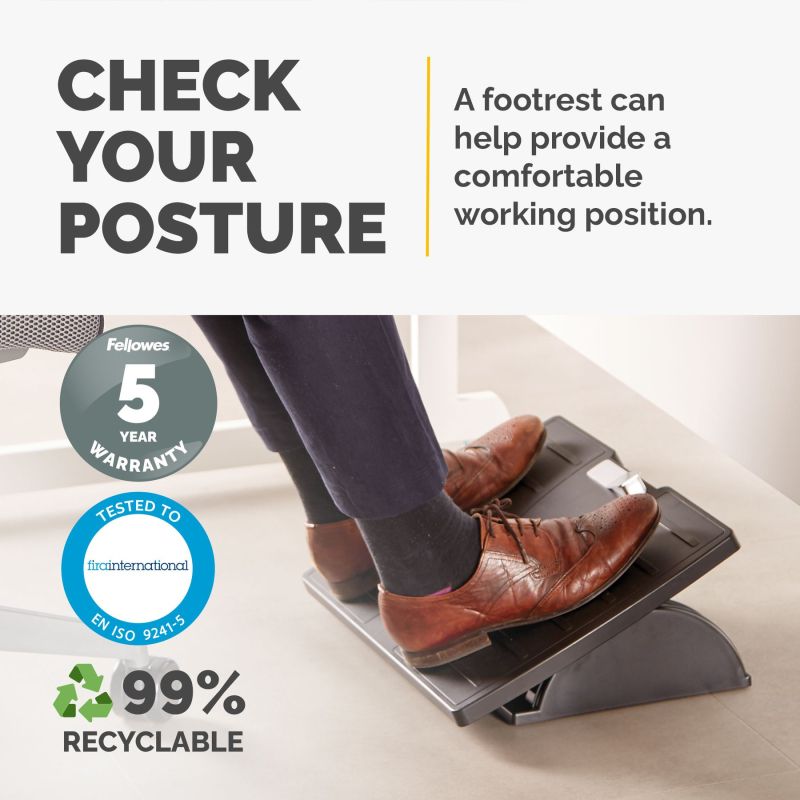 Регулируемата поставка за крака Fellowes Microban предотвратява дискомфорта в гърба и краката, като гарантира правилна стойка при седене.