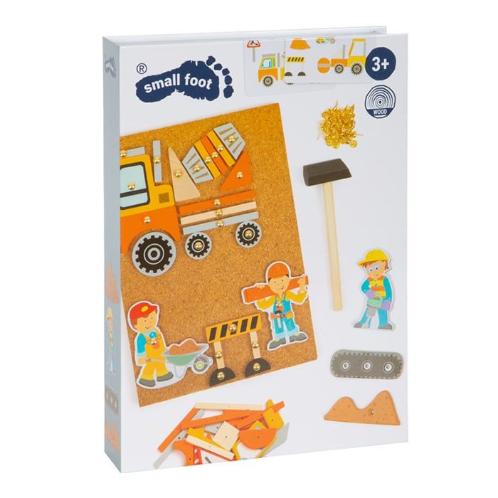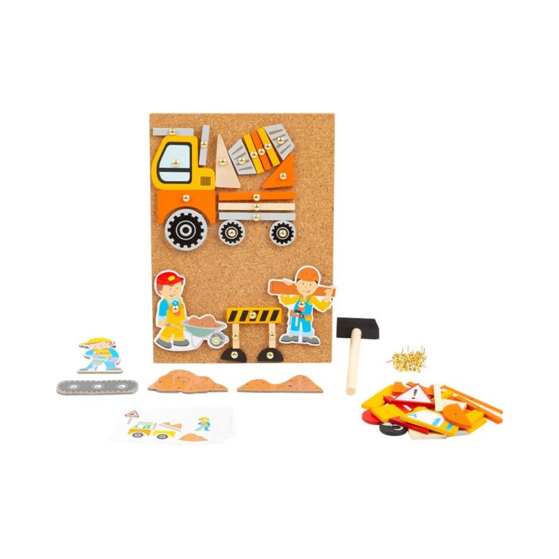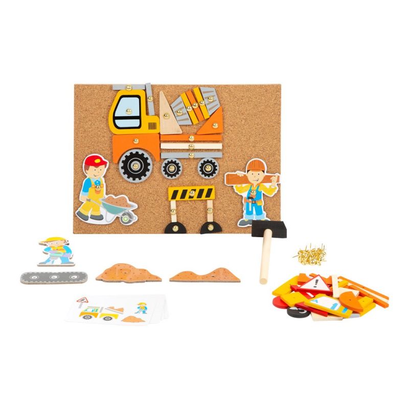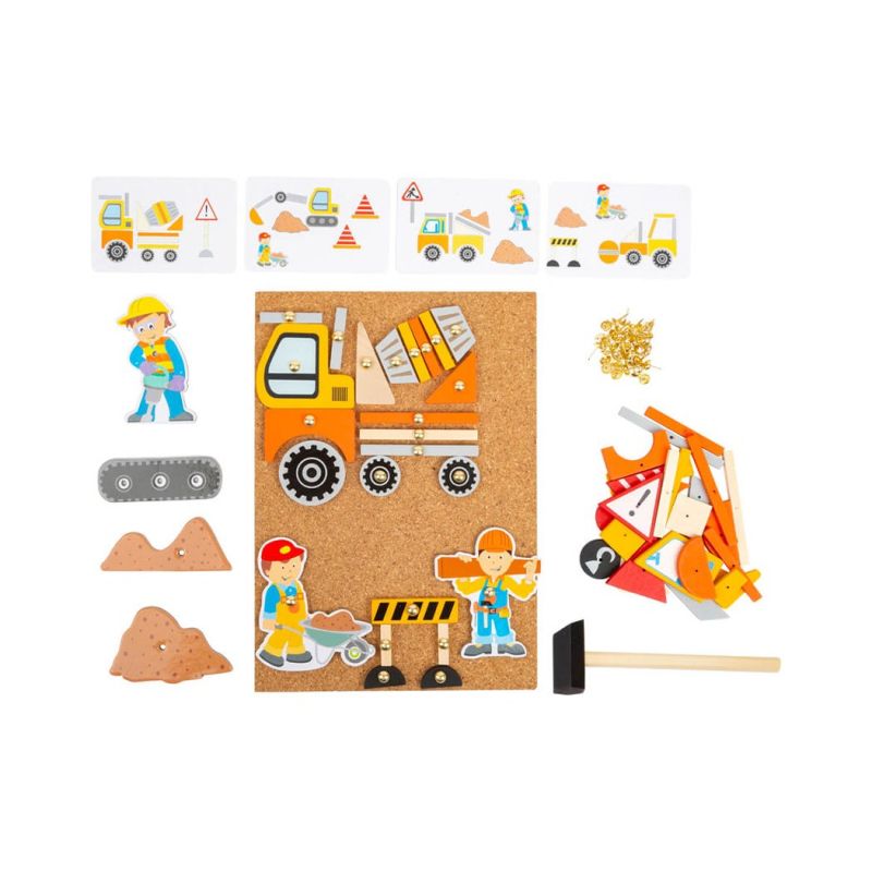 Снабдени с коркова дъска, чук, пирони и различни дървени елементи, децата могат да създават всякакви мотиви от строителни обекти с тази игра с чук.