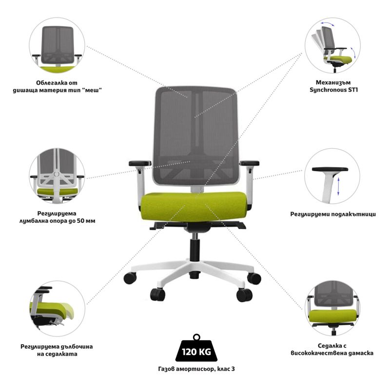 Ергономичен стол Rim Flexi FX1104 White, до 120 kg, зелен