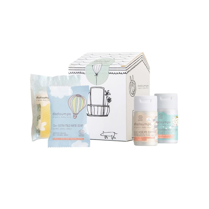 Комплектът съдържа: Органичен шампоан 0+ (30 ml), органичен подхранващ лосион (30 ml), органичен изключителен мек сапун (20 g), гъба за баня.