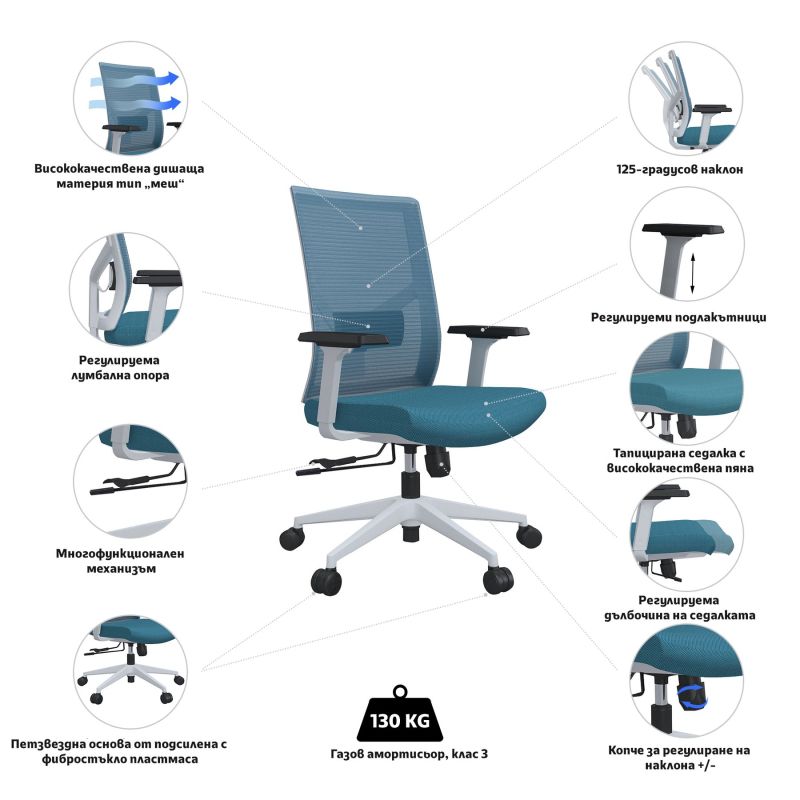 Естествената позиция на седене осигурява опора за бедрата и гръбнака, в следствие на което те стоят свободно и осигуряват свободното циркулиране на кръвта през цялото тяло. Когато искате да релаксирате, просто се отпуснете назад и се отдайте на заслужена почивка! Облегалката е изработена от дишаща материя тип „меш“, която позволява на въздуха да преминава свободно през нея и предотвратява изпотявате и дискомфорт.