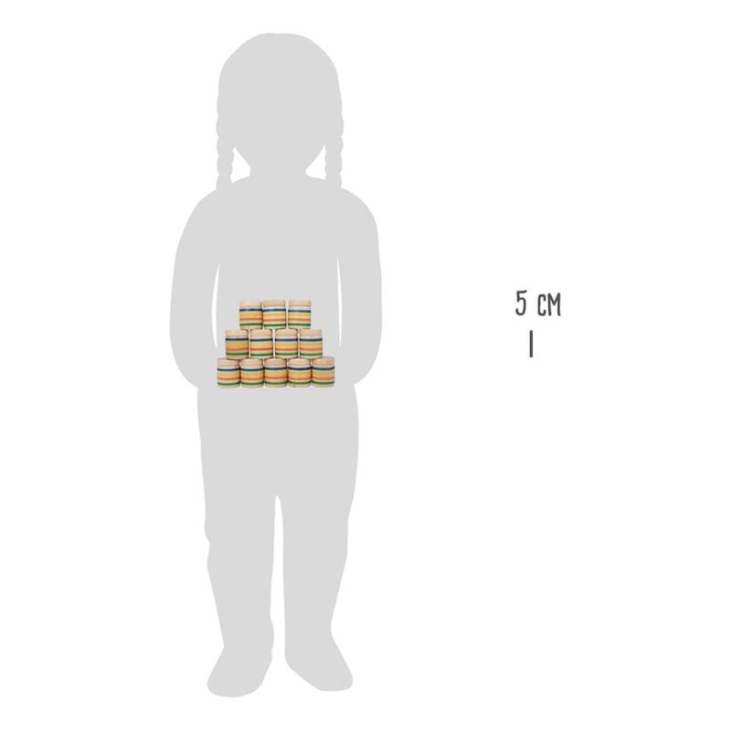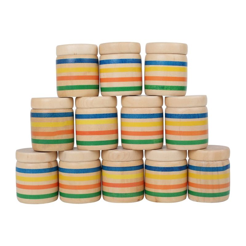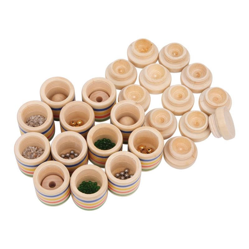 Всеки 2 кутии споделят едно и също съдържание и те трябва да бъдат проследени чрез сравняване на звука им! Дървеният пръстен издава различен звук от дървените топки, точно както металните топки звучат различно от малките камбанки, а малките камъчета се различават от фините стъклени мъниста.Размери: 5 cm x ø 4 cm.