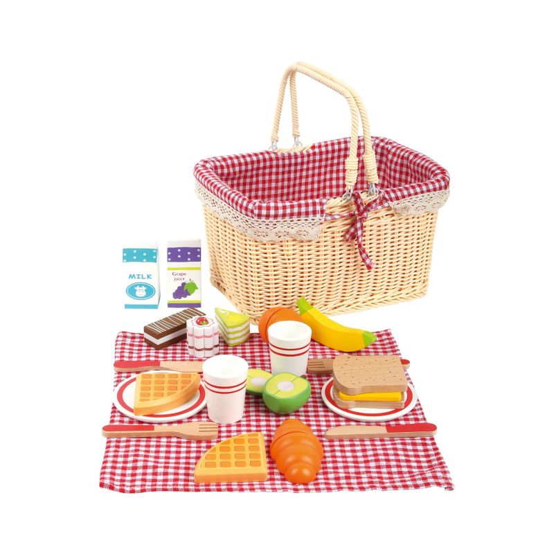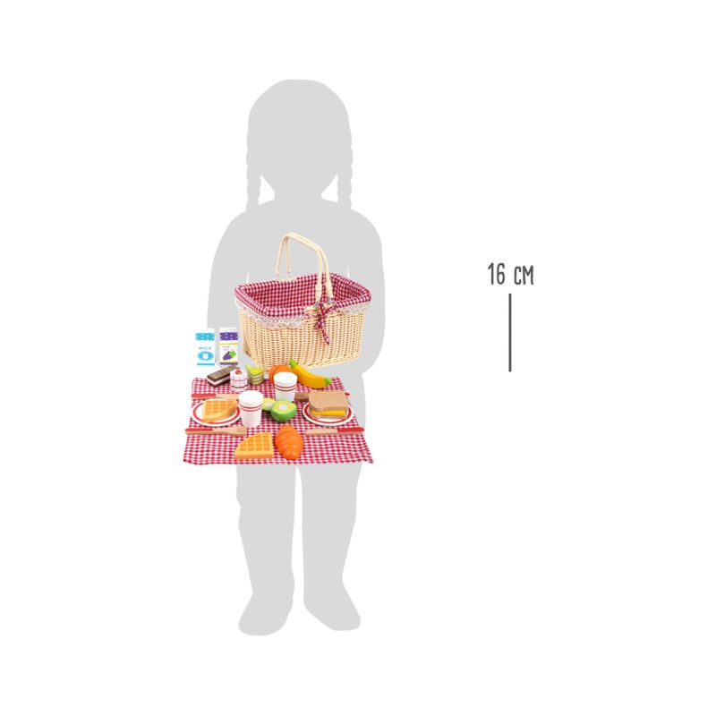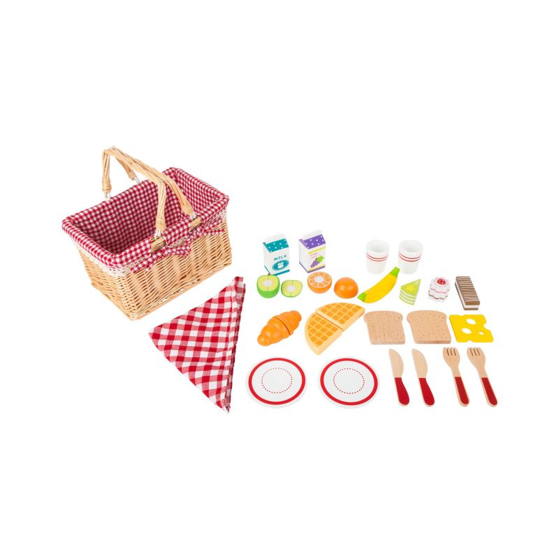 Време е за пикник! Кошницата за пикник съдържа одеяло за пикник със супер сладък дизайн. Всички аксесоари и прибори за пикник са направени от качествено дърво. Плодовете и кроасанът могат да бъдат разделени на парчета. Кошницата е подходяща за пренос до най-хубавите места за пикник, благодарение на сгъваемите дръжки. Карираната вътрешност е подвижна и следователно лесна за почистване.