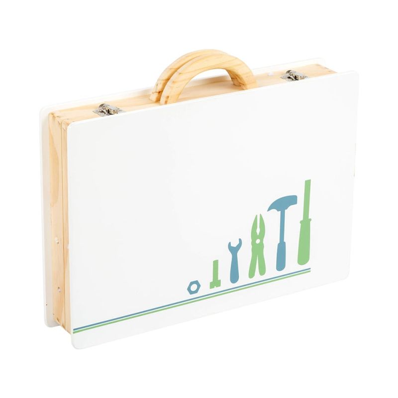 Благодарение на дървеното куфарче с инструменти младите занаятчии ще станат истински професионалисти. Аксесоарите като линийка, отвертка, клещи, чук ще направят играта изключително реалистична!
