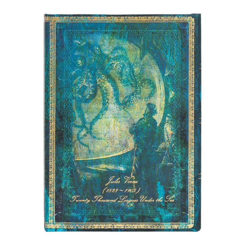 Жул Верн (1828–1905) е автор на някои от най-известните книги в света. Този украсен ръкопис в морско синьо съдържа страница от ръкописната чернова на Верн на „ Двадесет хиляди левги под водата“. Задната корица показва гравюра, изобразяваща капитан Немо, който наблюдава „калмар с колосални размери“.