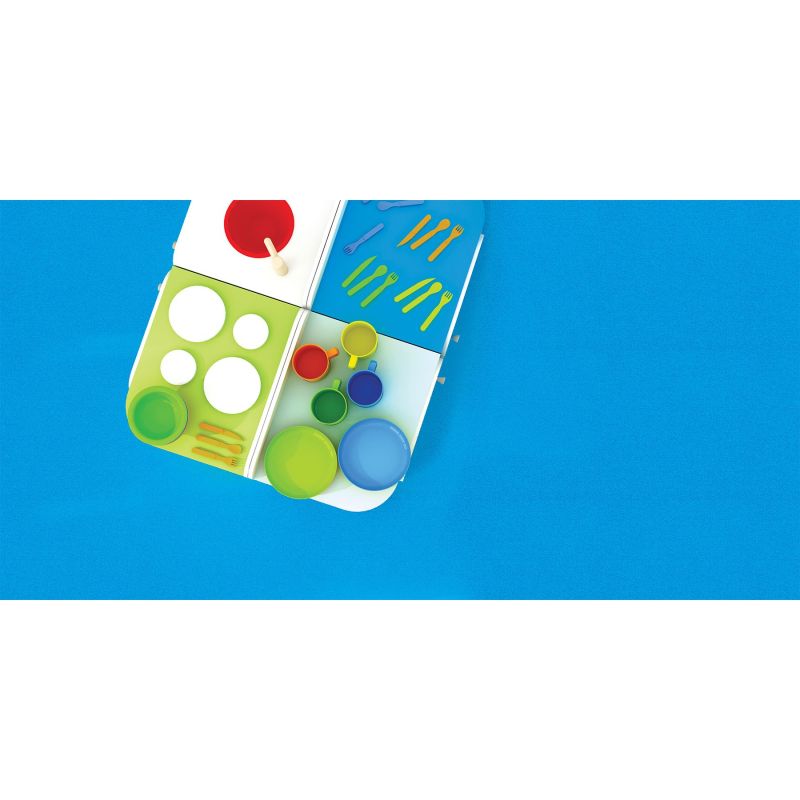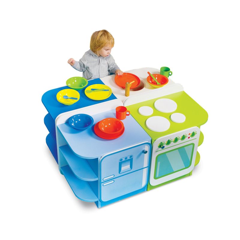 Детската кухня, изработена от дърво, съдържа всичко необходимо за незабравимите игри на малкия шеф готвач.
