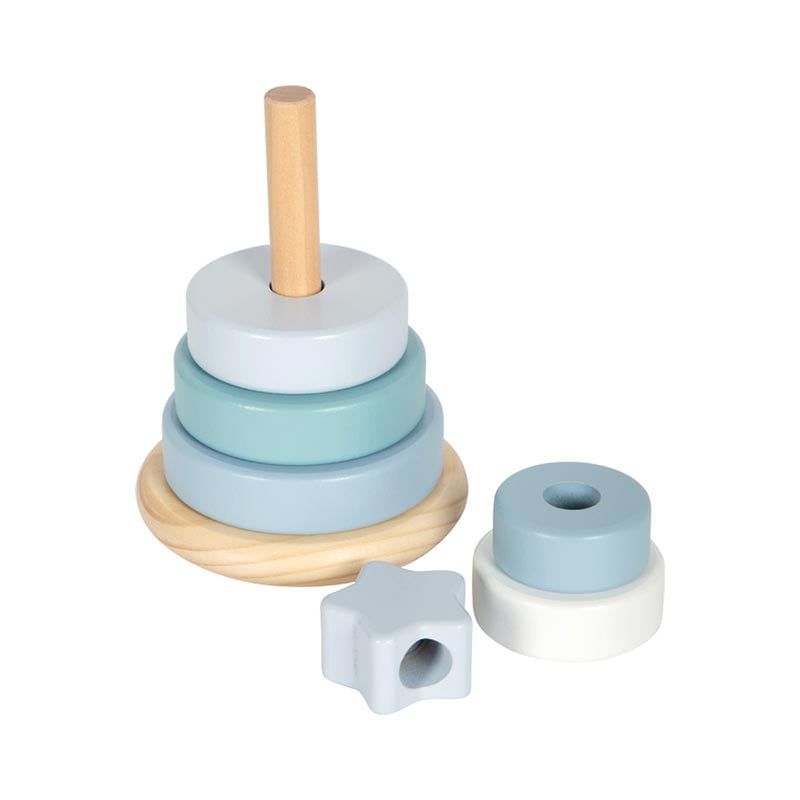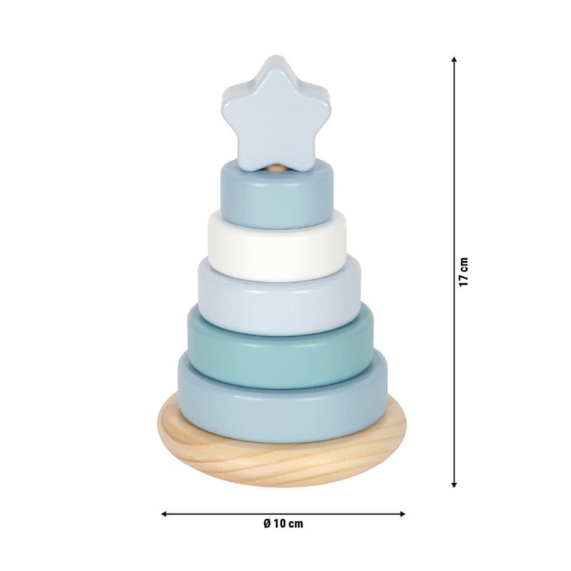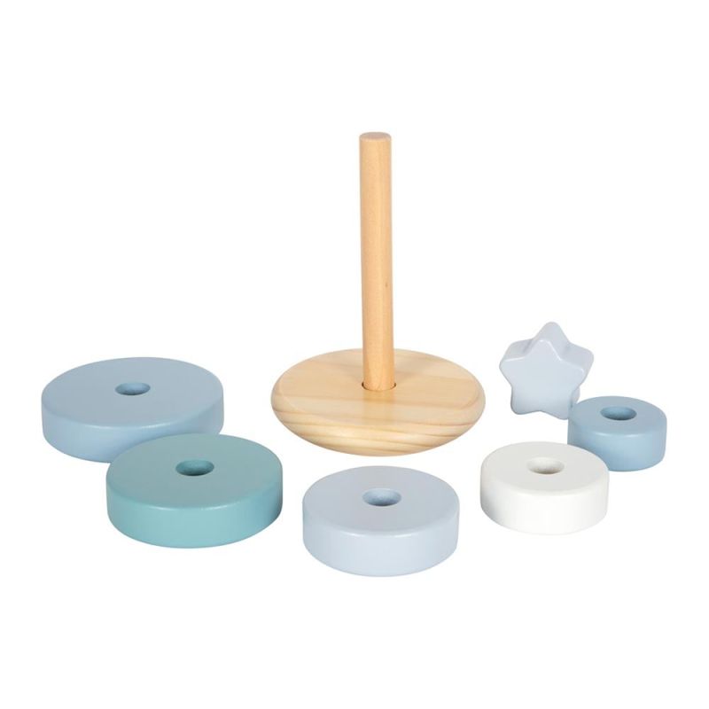 Седем пастелни ринга и заоблена основа приканват малките ръчички да сортират по размер, да подреждат и да наблюдават как кулата леко се поклаща. Успокояваща класика с елегантен дизайн.
