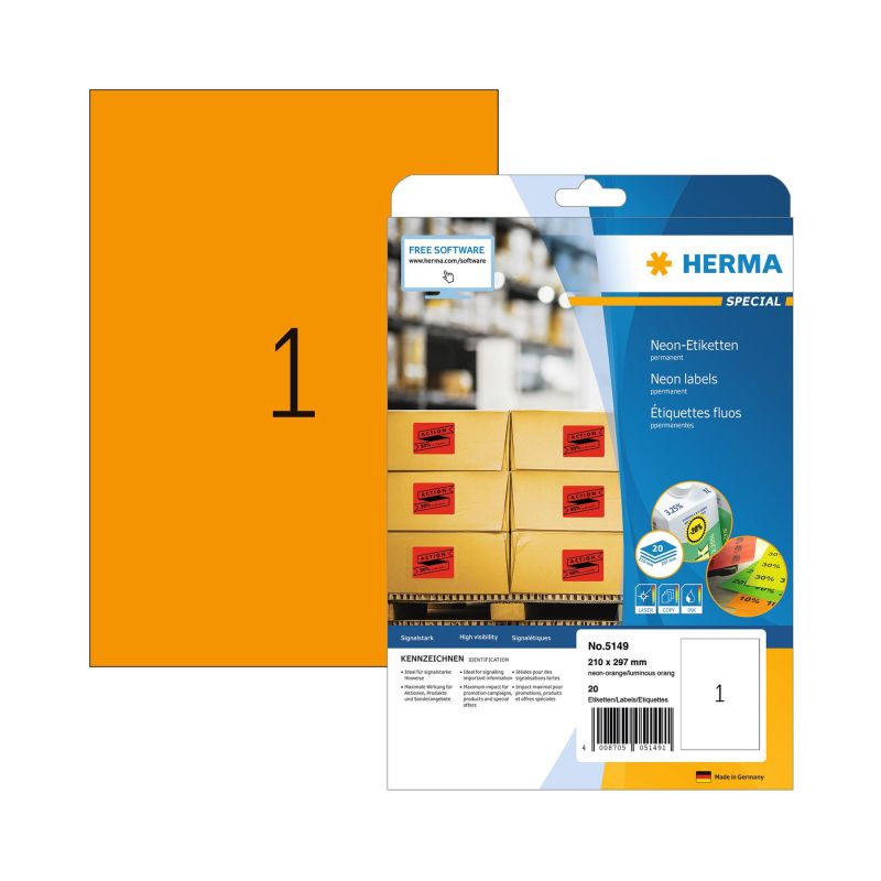 Herma Самозалепващи се етикети, A4, 210 х 297 mm, оранжеви, 20 листа