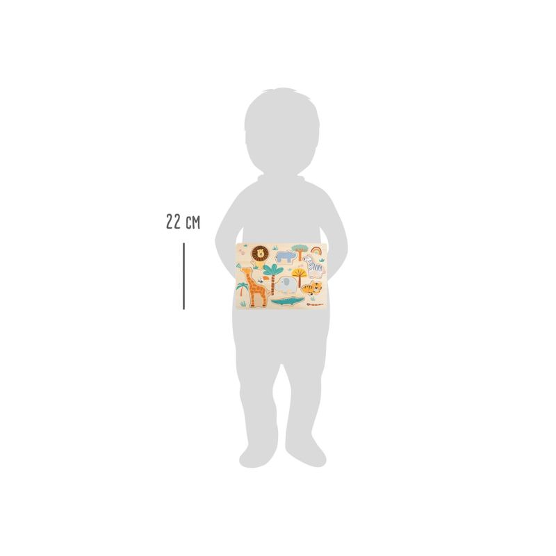 Добре дошли на сафари! Целта е да поставите седемте животни на подходящите места в дървения пъзел. Играта не само тренира двигателните умения и разбирането на различните фигури, но изисква и концентрация и търпение. Пъзелът впечатлява със своите весели сафари мотиви в модерни цветове.