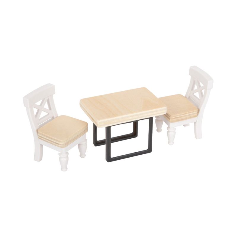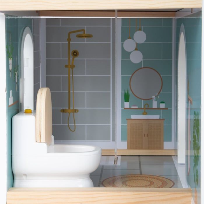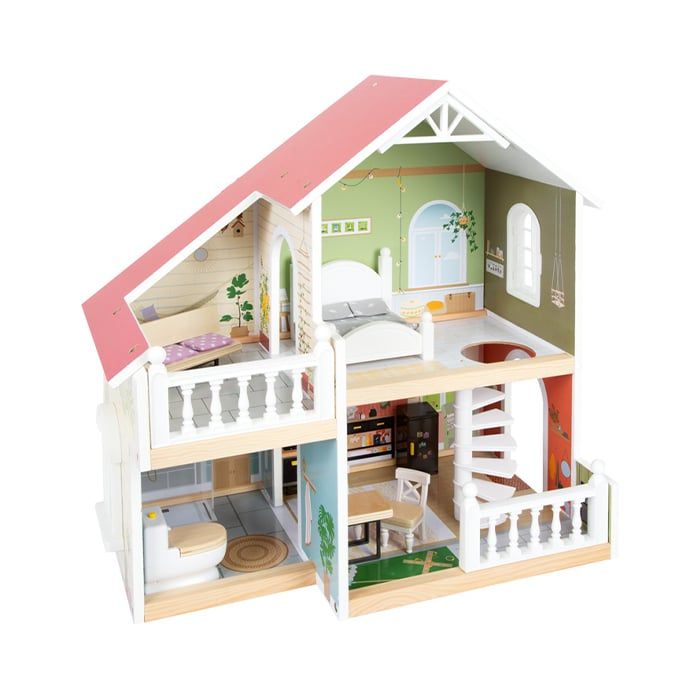 Акцентите на тази къща за кукли са голямата тераса на покрива със седалки и парапети, тоалетната с отваряем капак на седалката и кухненски шкафове и хладилник с врати и чекмеджета за особено реалистично изживяване при игра.