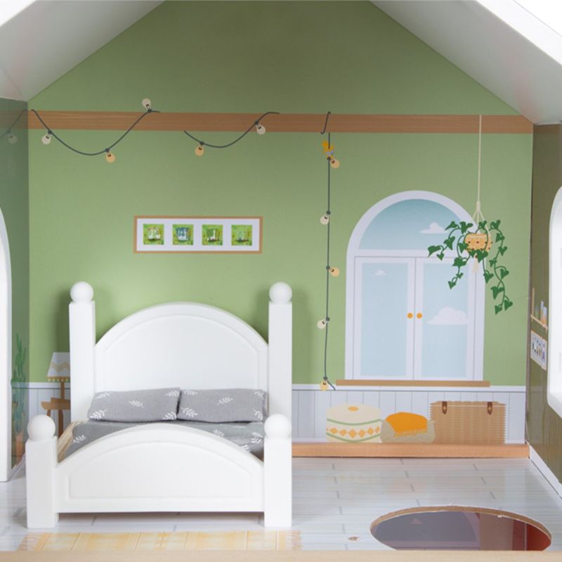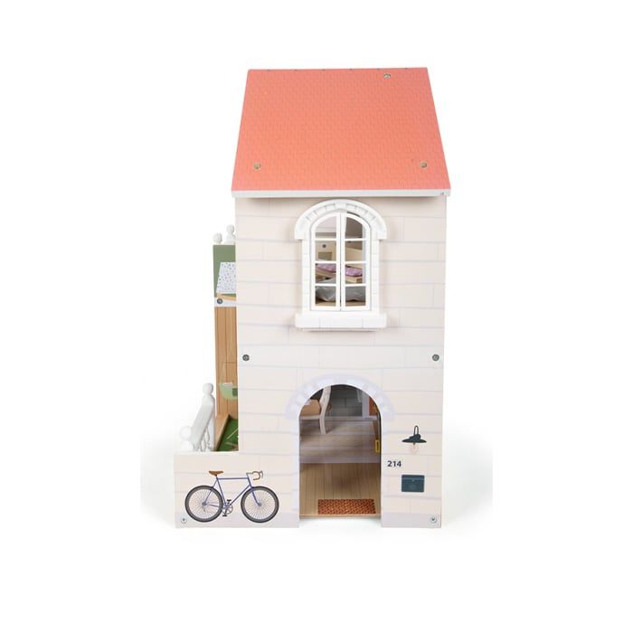 Тази къща за кукли се вписва чудесно във всяка всекидневна или детска стая, благодарение на светлата си външна фасада и модерна цветова схема.