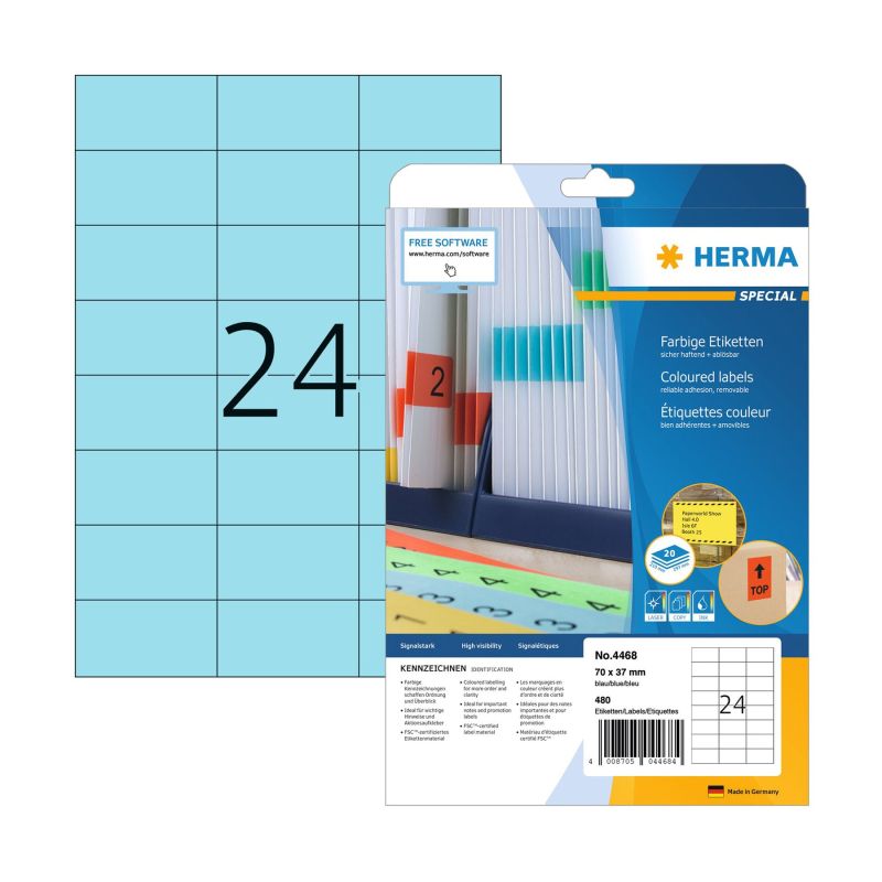 Herma Самозалепващи се етикети, A4, 70 х 37 mm, сини, 24 броя, 20 листа