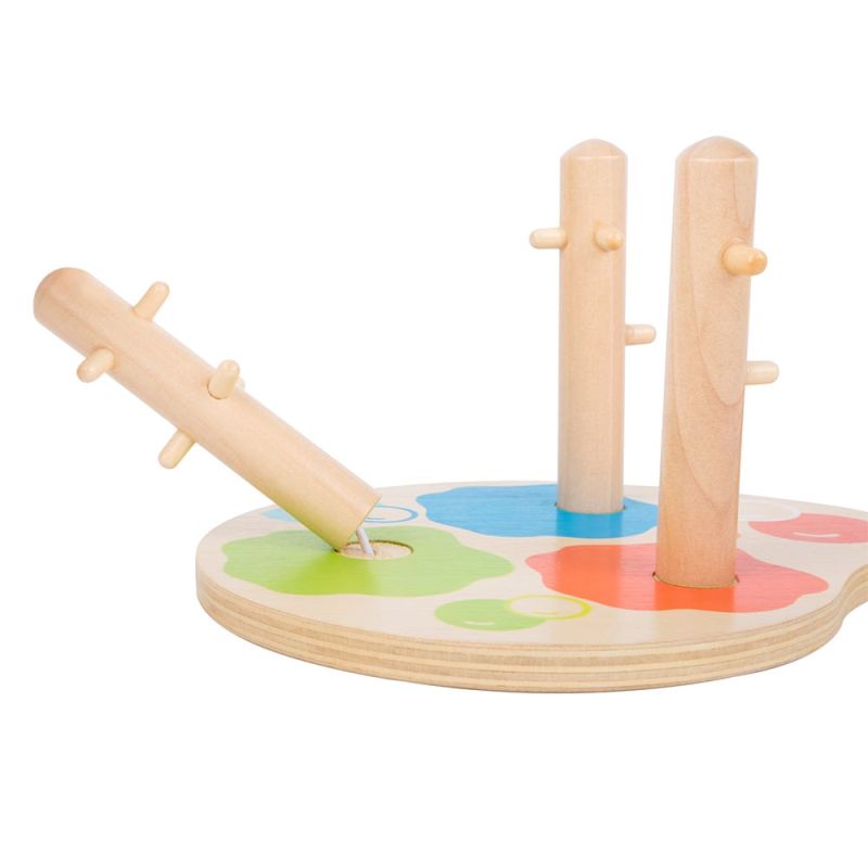 Пъзелът за нанизване стимулира двигателните уменения и логическо мислене у децата. Те трябва да сортират дървените геометрични фигури в правилното място. Не е толкова лесно, колкото звучи, защото формите трябва да бъдат поставени по такъв начин, че да се избегнат препятствията на подвижните дървени стълбове. Кой е готов за това предизвикателство?