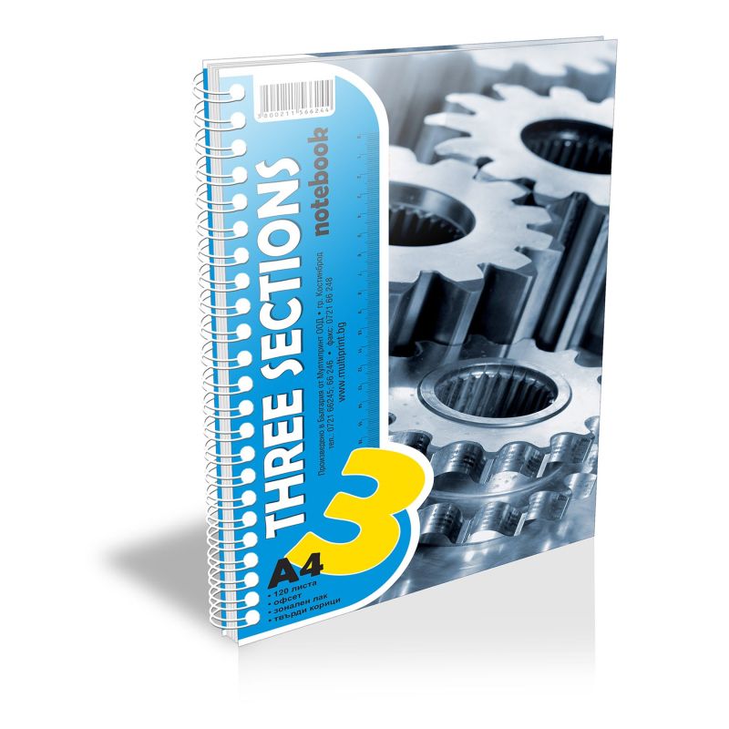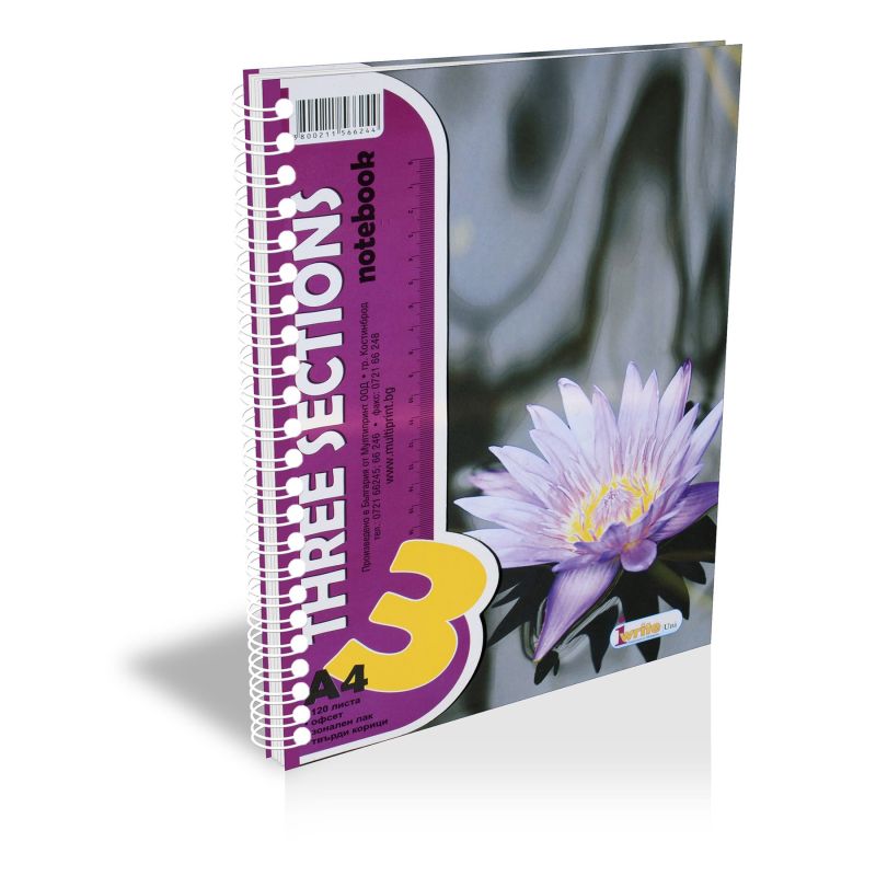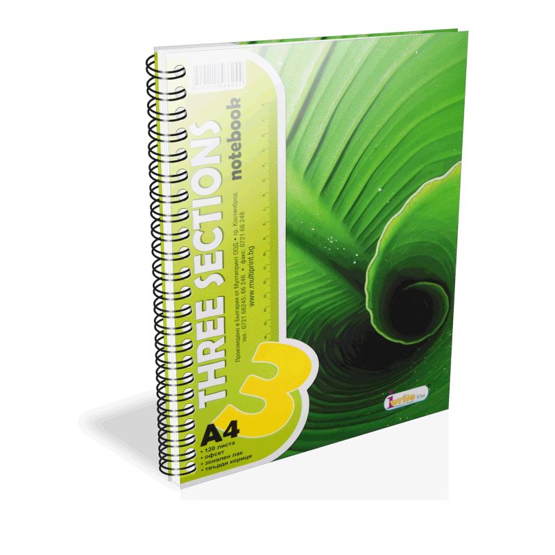 Тетрадка, A4, широки редове, 3 теми, офсетова хартия, метална спирала, твърда корица, 120 листа