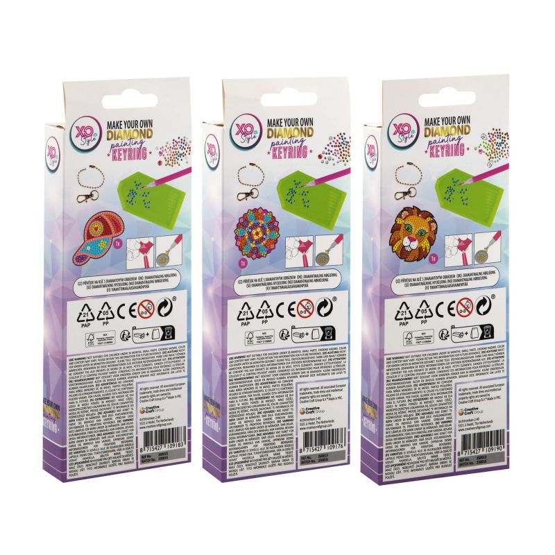 Всеки комплект включва - фигурка с възможност за залепване на мъниста, мъниста, апликатор за залепяне на мъниста, карабинер, верижка, основа за редене, спомагателна тавичка.