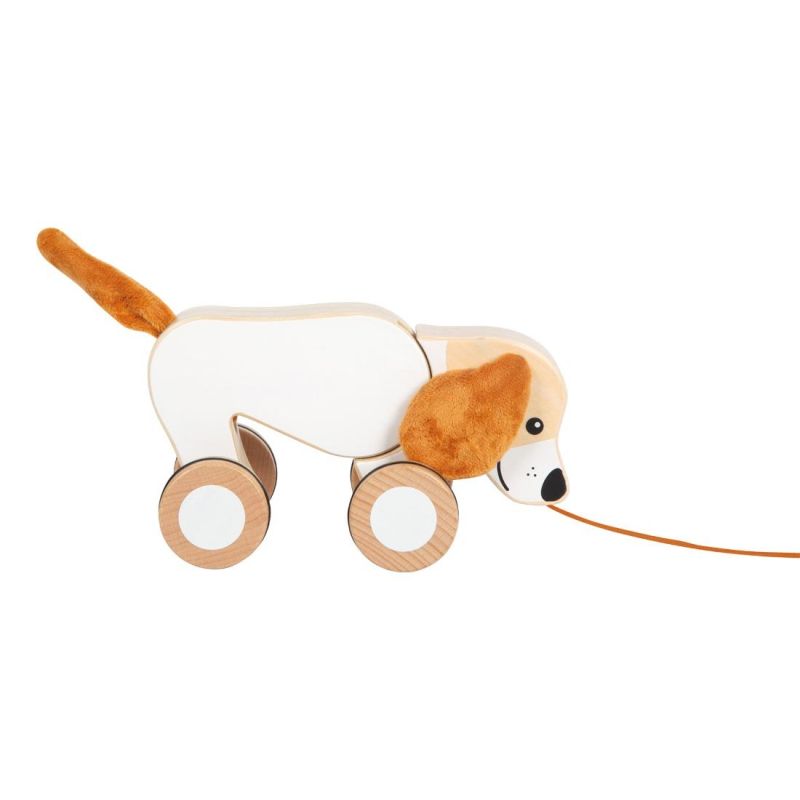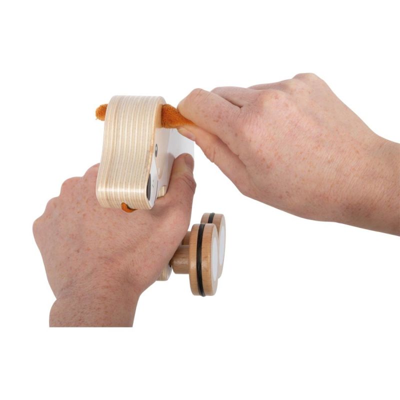 Тази дървена играчка за бутане и дърпане е създадена по принципите на образователните играчки Монтесори, като насърчава активната игра и подпомага естественото развитие на детето. Детето лесно може да дърпа кученцето със здравото въженце, което ще го стимулира да се движи повече и да открива нови пространства.