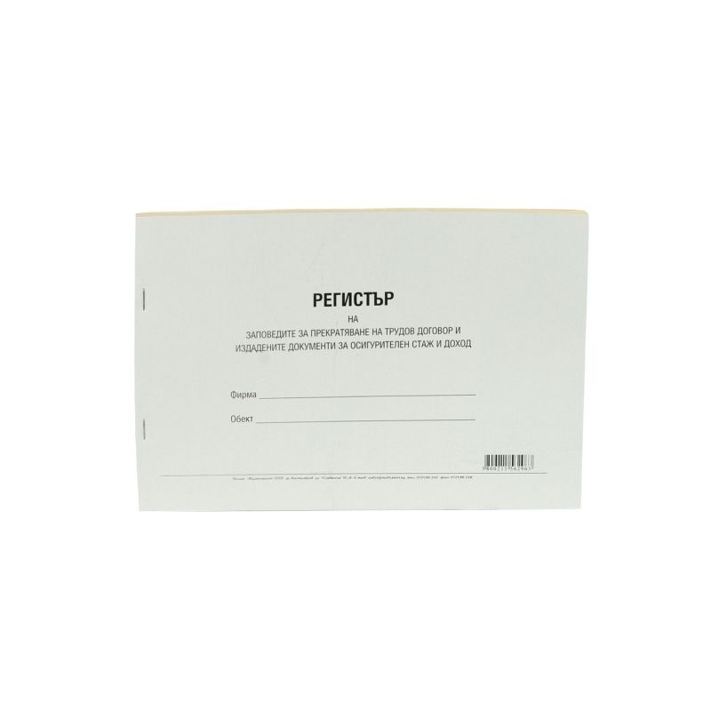 Начало ХАРТИЯ И ХАРТИЕНИ ИЗДЕЛИЯ Бланки и формуляри Личен състав, деловодство и ТРЗ Регистър на заповеди за прекратяване на трудови договори