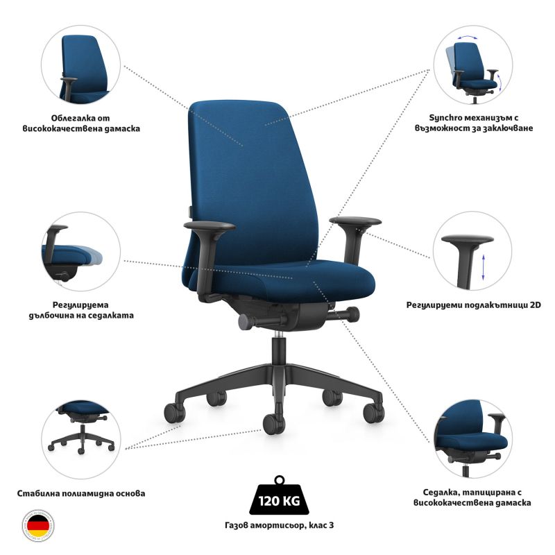 Ергономичен стол Interstuhl Every EV116, текстил, Synchronous механизъм, полиамидна основа, тъмносин