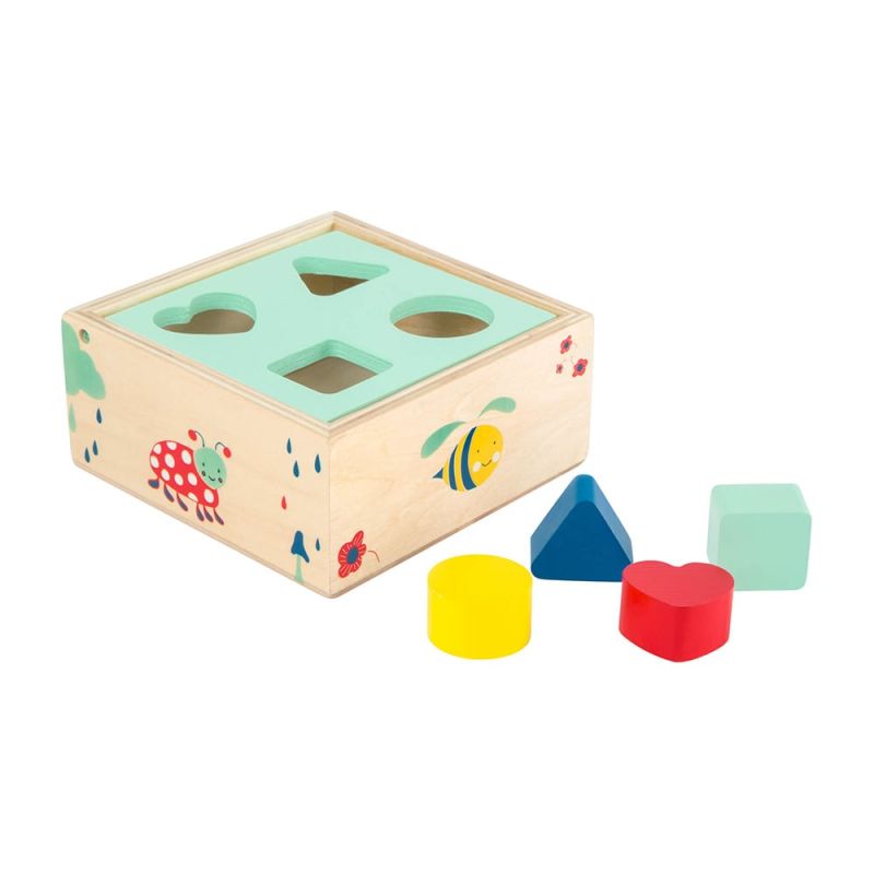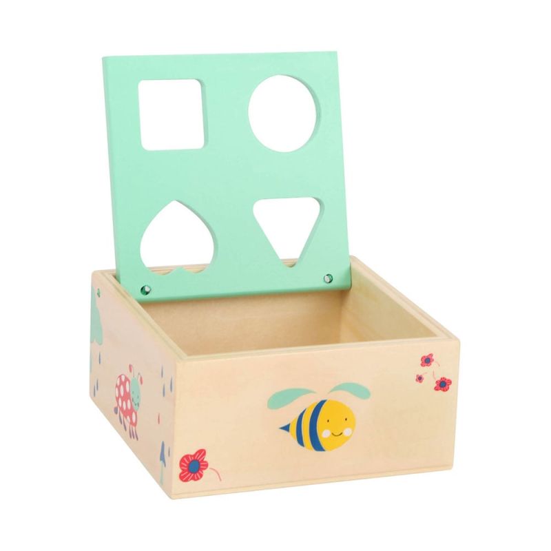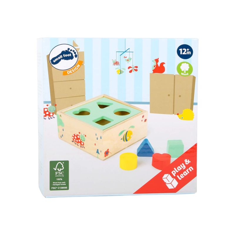 Формите и цветовете ще се научат чрез игра. Кубът е изработен от 100% сертифицирано дърво FSC®. Капакът се отваря и затваря лесно. Любопитните животни от горите и полята ще ви се усмихват по време на игра!