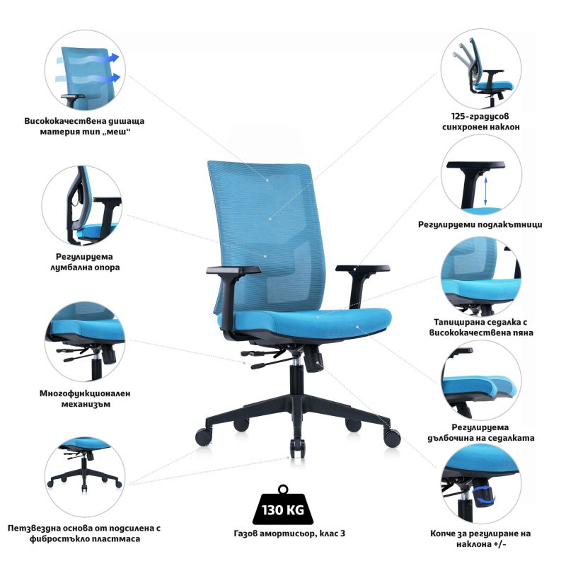 Освен стилен външен вид, столът разполага с множество функционалности, които осигуряват комфорт и удобство по време на целия работен процес. Лумбалната опора в задната част на облегалката ще се погрижи за правилната стойка на гърба Ви и ще намали напрежението в кръста. Ще забравите за болките и дискомфорта и ще се концентрирате изцяло върху работния процес и задълженията си. Дишащата материя на облегалката тип „меш“ позволява на въздуха да циркулира свободно и предпазва гърба Ви от изпотяване през горещите дни.