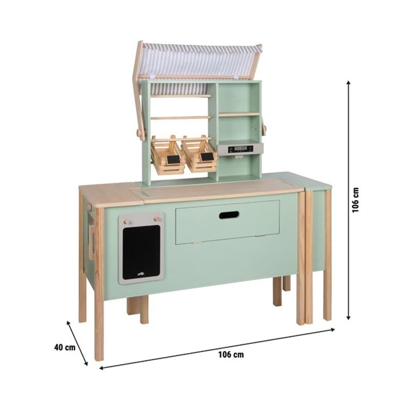 Модулна 2-в-1 станция за ролева игра в актуален салвия-зелен цвят: може да се използва като кухня, магазин, щанд, кафене или бар. Оборудвана с детайли като скенер/мивка, кран/каса, кафе машина, грил/котлон и фурна/хладилник. Елементите се съединяват, за да пестят място.