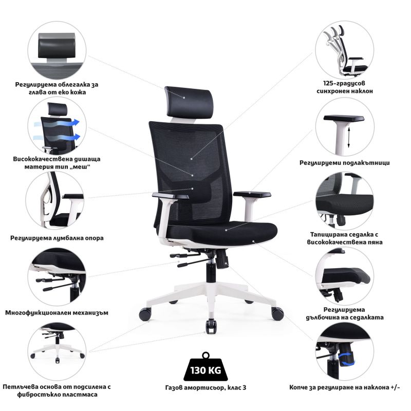 Какво да очаквате от столове Snow HBИновативния дизайн и модерна визия, които безупречно следват тенденциите за ергономия на офис столовете, ще го направят чудесно попълнение към всеки интериор. Стилният му акцент е в изящната снежно бяла рамка и стабилната петлъчева основа, която ще Ви осигури мобилност през целия ден. За да поддържате добрия тонус на тялото си има допълнителна опора за главата, изработена от еко кожа, както и специално проектирана лумбална опора, която да държи всяка извивка на гръбначния стълб в правилна позиция и предотвратява появата на болки в гърба и лумбалната област при продължително седене. Дишащата материя тип „меш“, от която е изработена облегалката ще позволи на въздуха да преминава свободно и ще предпази гърба Ви от изпотяване и дискомфорт през горещите дни.