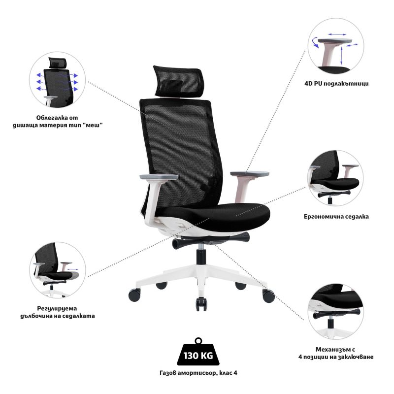 Облегалката на стола е изработена от дишаща материя тип „меш“, която позволява на въздуха да преминава свободно и предпазва гърба Ви от затопляне през горещите дни. Към облегалката е добавена и допълнителна опора за глава, за да се чувствате добре от главата до петите! Люлеещият механизъм, който позволява заключване в четири възможни позиции, осигурява възможност за променяне на позата така, че да не губите опората в кръста и да държите гърба си изправен. Това, освен че Ви помага да запазите тонуса и енергията си, запазва здравето Ви и намалява риска от изкривяване и други негативни последици от неправилна стойка. Столът позволява регулиране на височината на седене, така че да не натоварвате тялото си, докато работите.