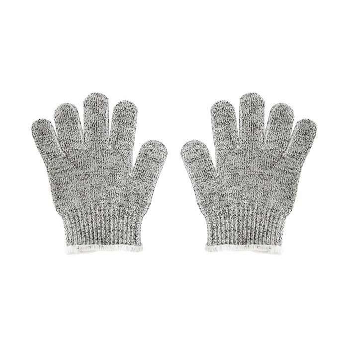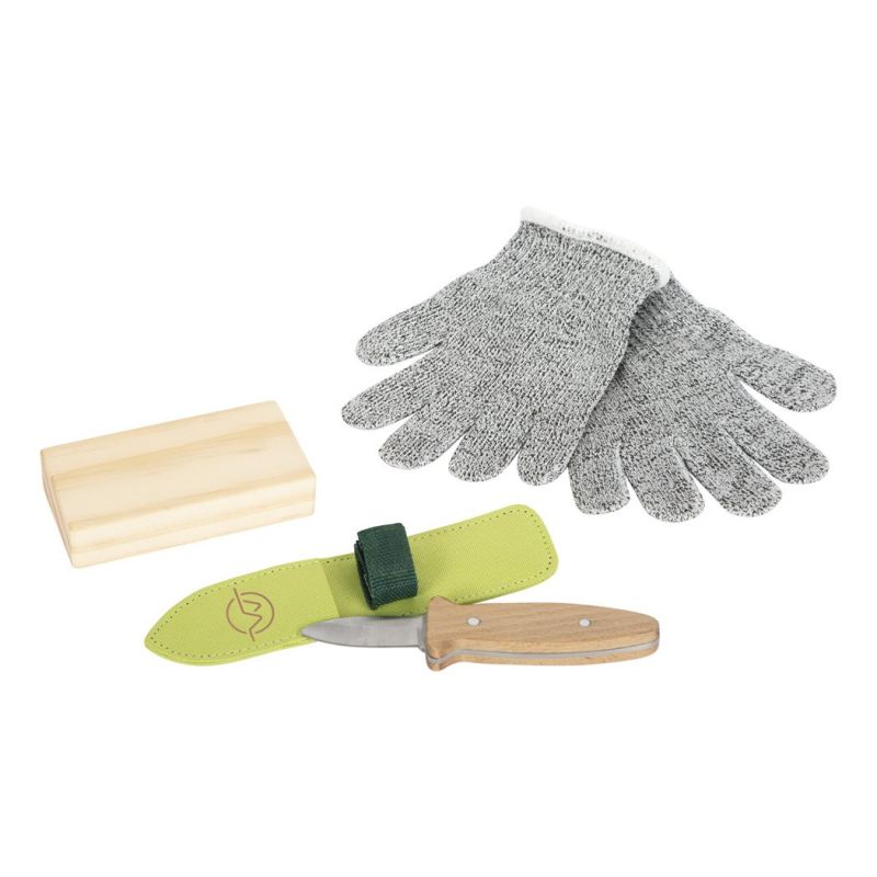 В комплекта ще откриете и чифт специални ръкавици за защита от рязане в детски размер и дървен блок за рязане.