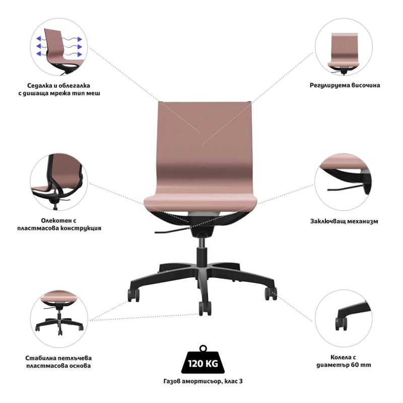 • Седалката и облегалката са тапицирани с дишаща мрежа, тип меш.