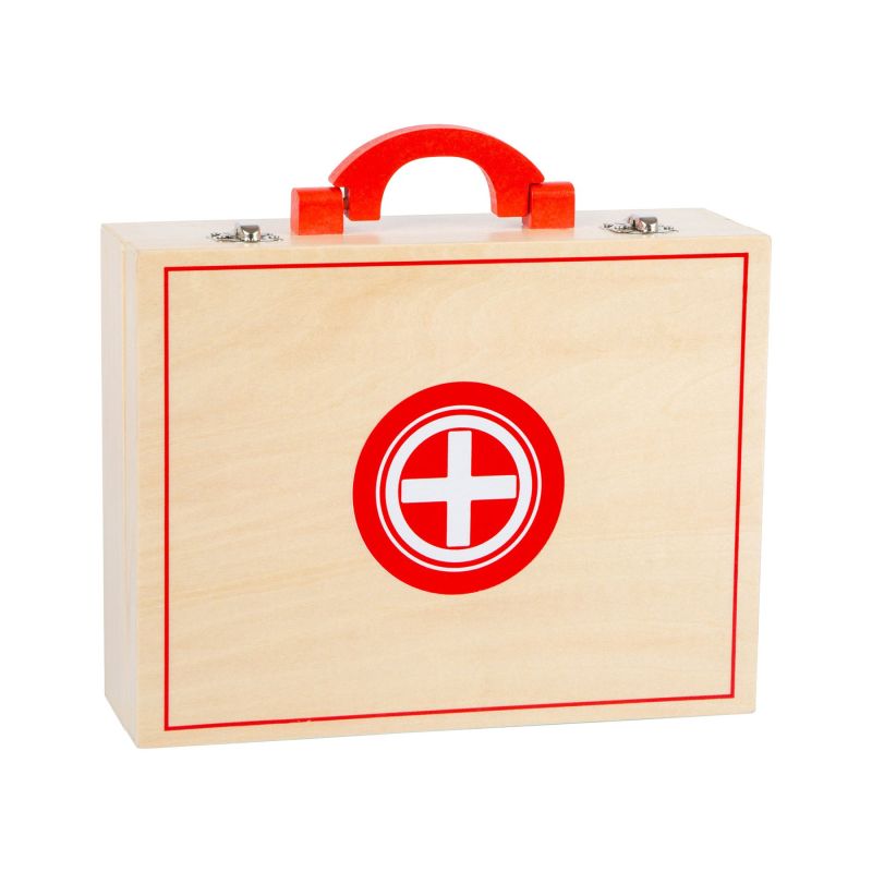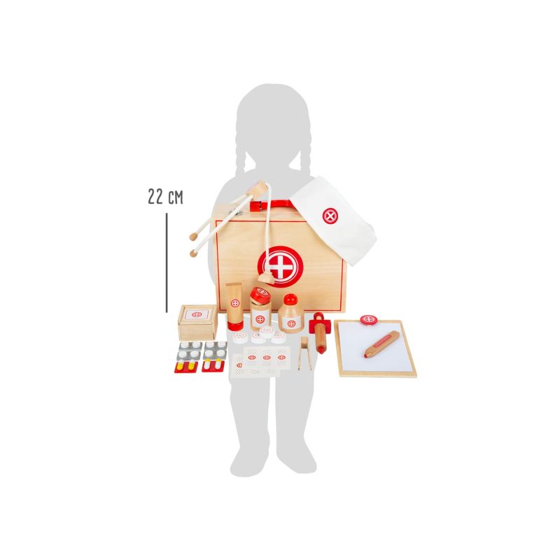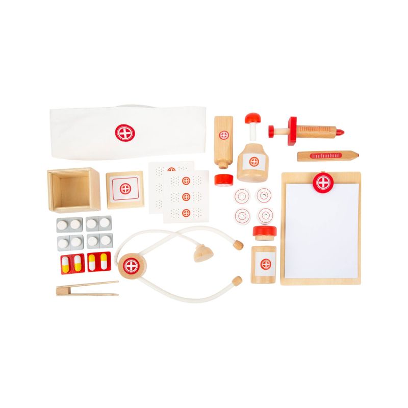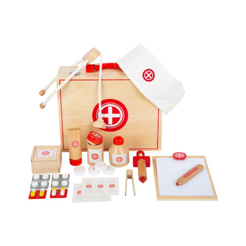 Докторът идва! Младите доктори ще бъдат добре оборудвани, когато отидат при своите пациенти, с този докторски дървен комплект. Калъфът и всички медицински инструменти правят страхотно впечатление с класическите си цветове и качествена изработка. В допълнение към бутилка с тинктура, стетоскоп и спринцовка, комплектът включва също лепенки, таблетки, пинсети, клипборд с бележник и термометър. Този комплект има всичко необходимо за осигуряване на първа помощ на кукли или животни играчки! Превключването в ролята на лекар и лечението на пациентите вдъхновява креативността и укрепва самочувствието на децата. Ролята на доктор и грижата за пациентите насърчава креативността, като същевременно укрепва детското самочувствие. Всички аксесоари се побират в дървения куфар.