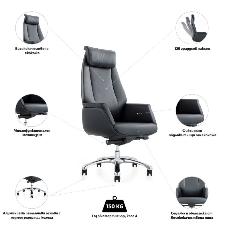 Заложете на стил и качество само с един продукт! Ако и вие сте от хората, които работят в седнало положение дълго време, трябва да помислите до какви последствия води това и как да помогнете на тялото си да запази най-добрата си форма! Работното кресло RFG съчетава красив и модерен дизайн, с който ще пасне чудесно на всеки интериор. Благодарение на ергономичната седалка и облегалка, изработени от полиуретанова пяна, можете да откриете най-удобната позиция на тялото си, като това ще Ви позволи да останете продуктивни и концентрирани през целия ден. Изработени са от висококачествена еко кожа, което прави столът страхотен избор за Вашия офис. Люлеещият се механизъм, който позволява заключване в четири възможни позиции, осигурява възможност да променяте позата си така, че да не губите опората в кръста и да държите гърба си изправен. Това освен, че Ви позволява да поддържате тонуса и енергията си, запазва здравето Ви и намалява риска от изкривяване и други негативни последици от неправилна стойка. Креслото позволява регулиране на височината на седене, така че да не изкривявате тялото си, докато работите. Елегантната петлъчева хромирана основа позволява да движите стола плавно, без да се налага да прилагате допълнителна сила и дори без да се налага да ставате от него!