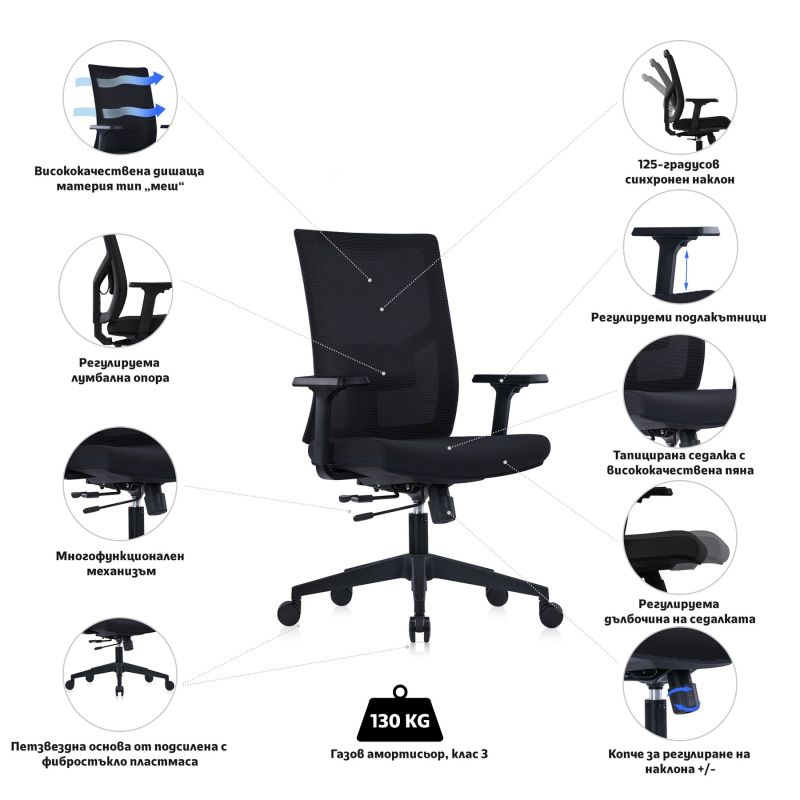 Освен стилен външен вид, столът разполага с множество функционалности, които осигуряват комфорт и удобство по време на целия работен процес. Лумбалната опора в задната част на облегалката ще се погрижи за правилната стойка на гърба Ви и ще намали напрежението в кръста. Ще забравите за болките и дискомфорта и ще се концентрирате изцяло върху работния процес и задълженията си. Дишащата материя на облегалката тип „меш“ позволява на въздуха да циркулира свободно и предпазва гърба Ви от изпотяване през горещите дни.