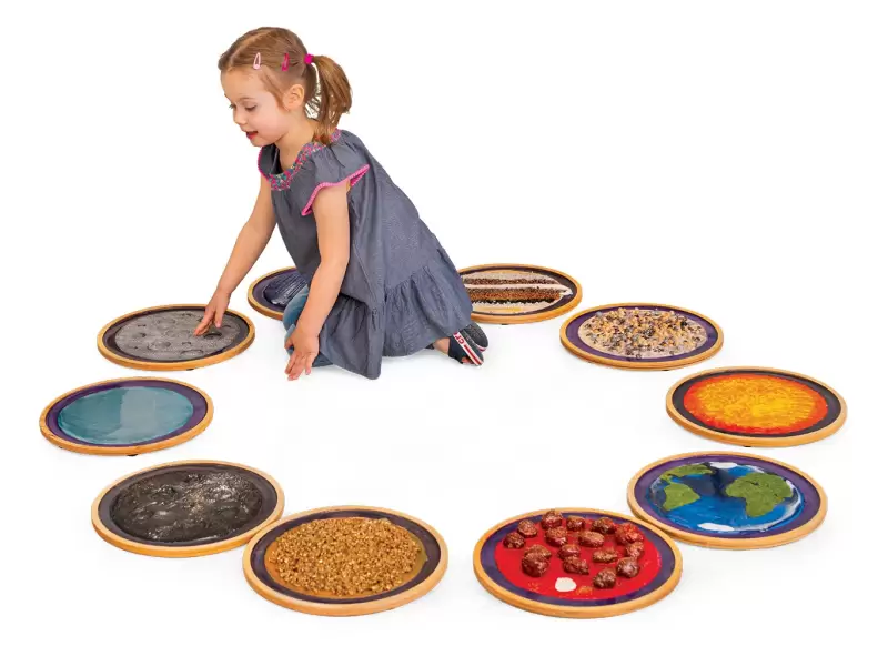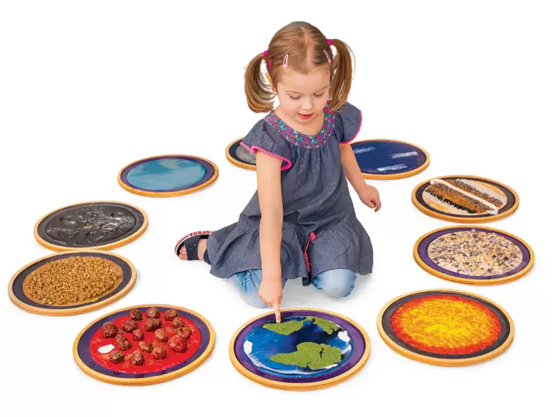 Сензорният панел „Космос“ на Nowa Szkola е специално разработен, за да стимулира детското въображение и сетивата чрез тематика, свързана с космоса и планетите. Комплектът включва девет дискови елемента с различни релефи, цветове и текстури, които предизвикват интерес и насърчават изследването чрез докосване и игра.