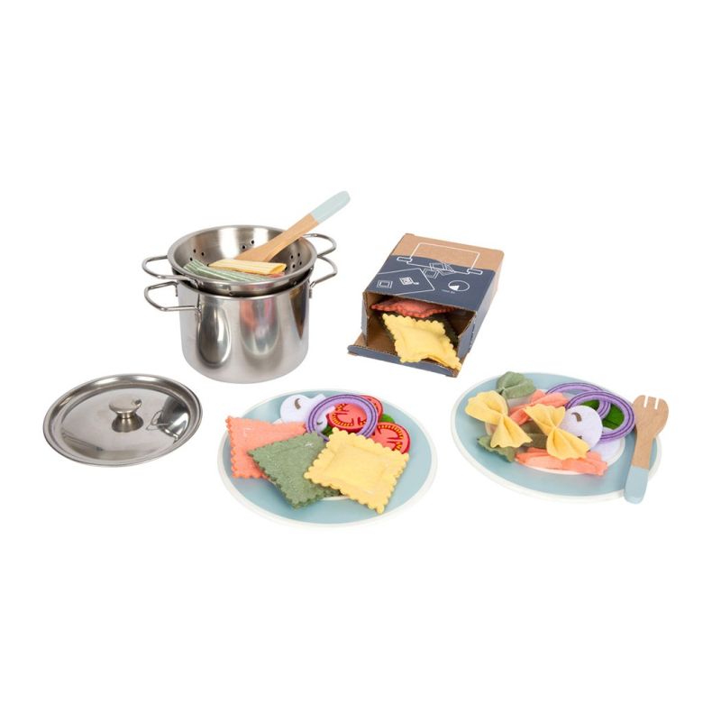 С този комплект за готвене нищо няма да попречи на следващото италианско празненство! Трите различни вида паста (фарфале, пенне, тортелини), както и гъбите, доматите, марулята и лукът, изработени от филц, ще осигурят истинско забавление по време на детската игра.