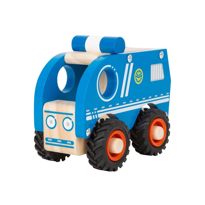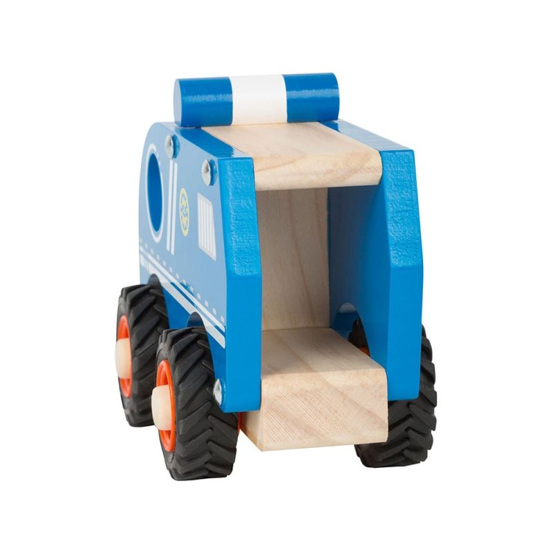 Дървената кола се ускорява по гладък и неравен терен със здравите си гумени колела. Ако крадецът бъде хванат, в багажника има място за него и малкият полицай може да го хвърли в затвора, докато седи на шофьорското място.Размери: 13 x 7 x 10 cm.