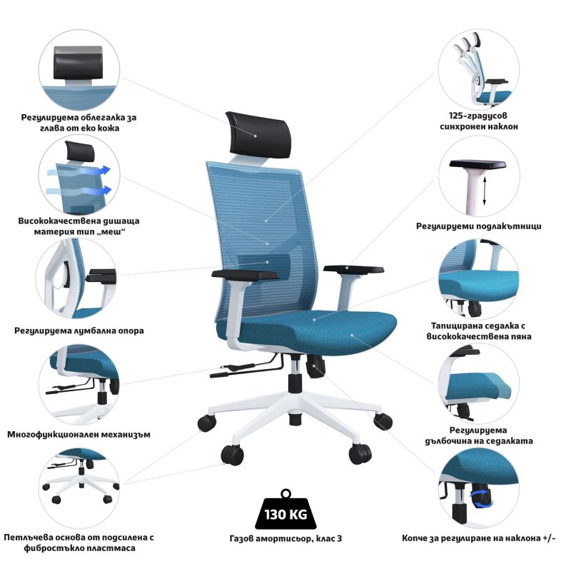 Какво да очаквате от столове Snow HBИновативния дизайн и модерна визия, които безупречно следват тенденциите за ергономия на офис столовете, ще го направят чудесно попълнение към всеки интериор. Стилният му акцент е в изящната снежно бяла рамка и стабилната петлъчева основа, която ще Ви осигури мобилност през целия ден. За да поддържате добрия тонус на тялото си има допълнителна опора за главата, изработена от еко кожа, както и специално проектирана лумбална опора, която да държи всяка извивка на гръбначния стълб в правилна позиция и предотвратява появата на болки в гърба и лумбалната област при продължително седене. Дишащата материя тип „меш“, от която е изработена облегалката ще позволи на въздуха да преминава свободно и ще предпази гърба Ви от изпотяване и дискомфорт през горещите дни.
