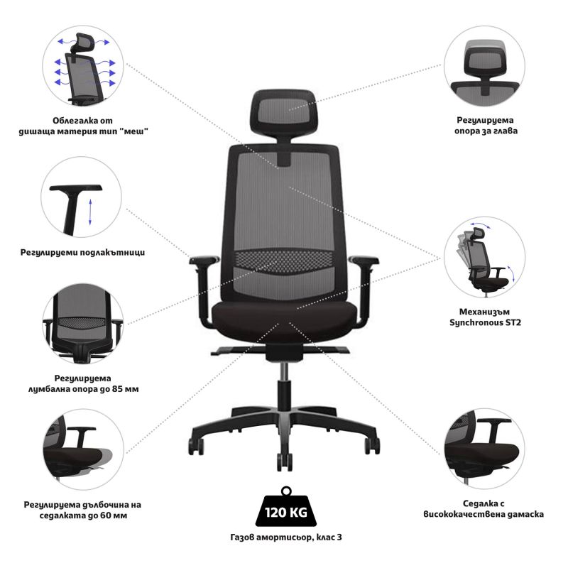 Ергономичен стол Rim Victory VI 1401, Synchronous ST2 механизъм, до 120 kg, черен