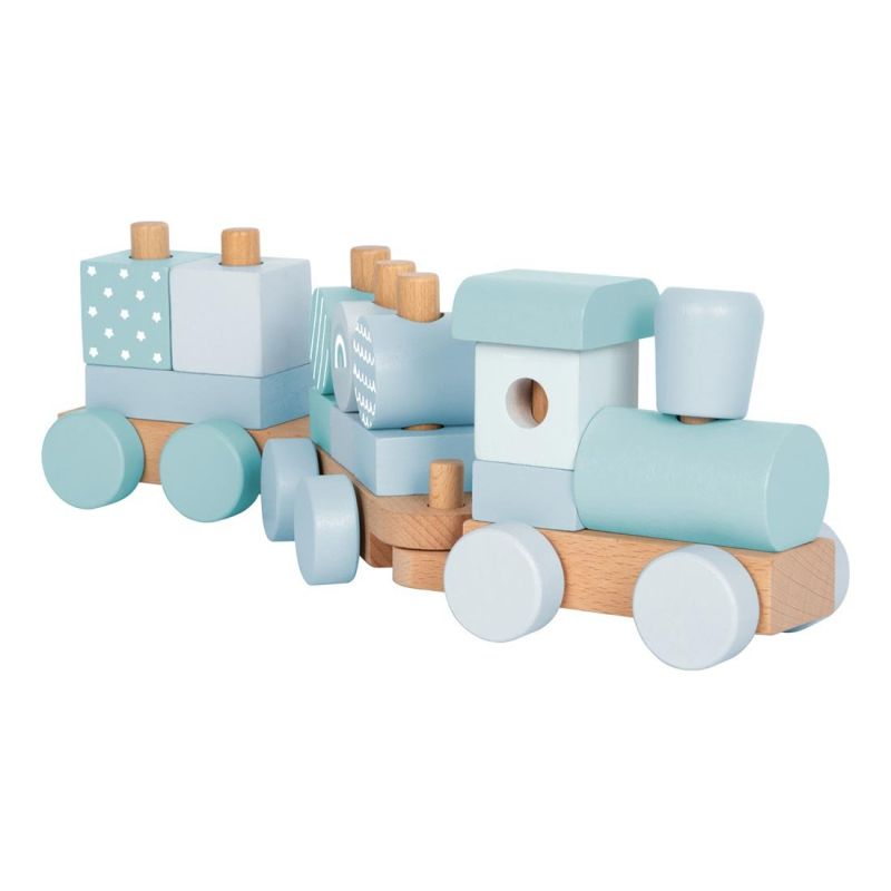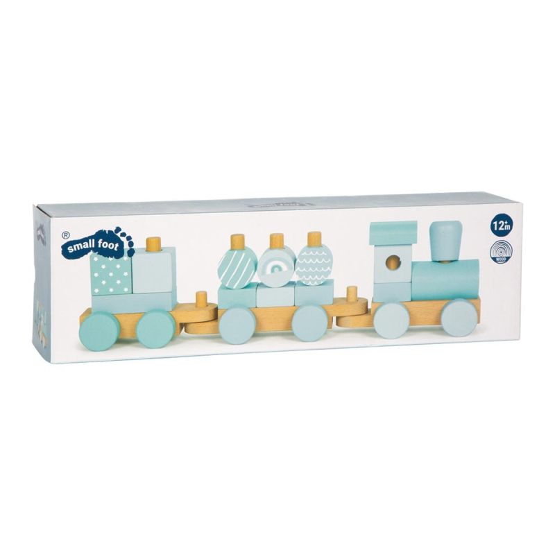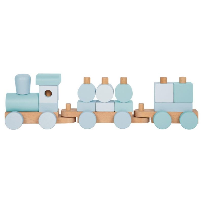 Модерен 2-в-1 дървен влак и игра за вграждане в успокояващи сини тонове. Включва 14 елемента за нанизване, локомотив и два вагона. Блокчетата могат да се използват и отделно за креативна игра.