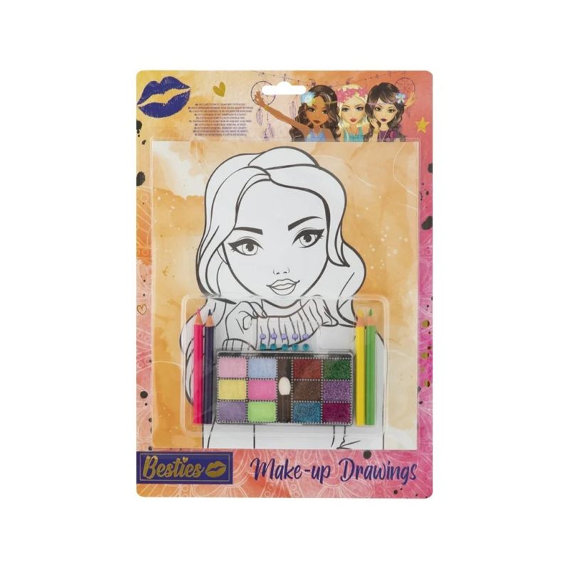 В книжката ще откриете 4 невероятни модела, които да разкрасите, 4 цветни молива и грим с четка.