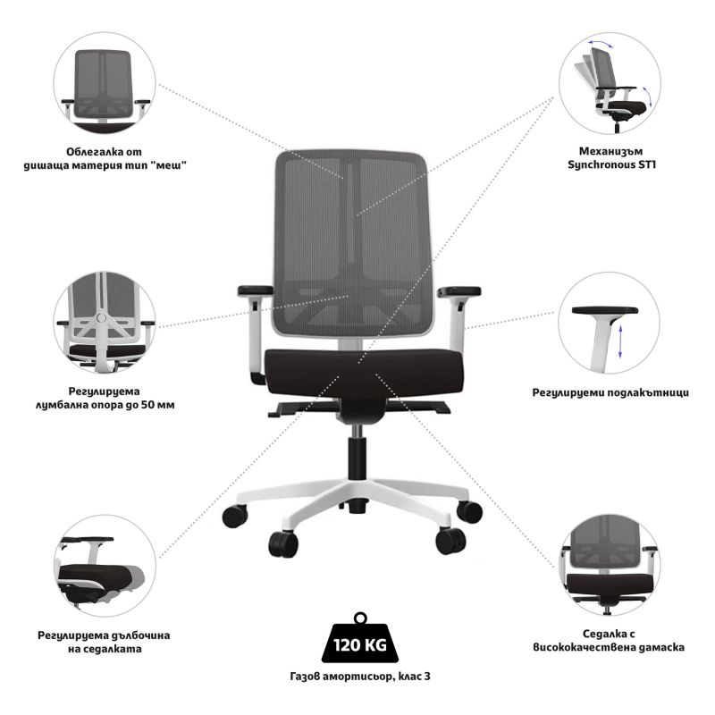 • Благодарение на иновативния си механизъм и интуитивната работа, настройката на всяка функция опростява работата и осигурява максимален комфорт при седене.