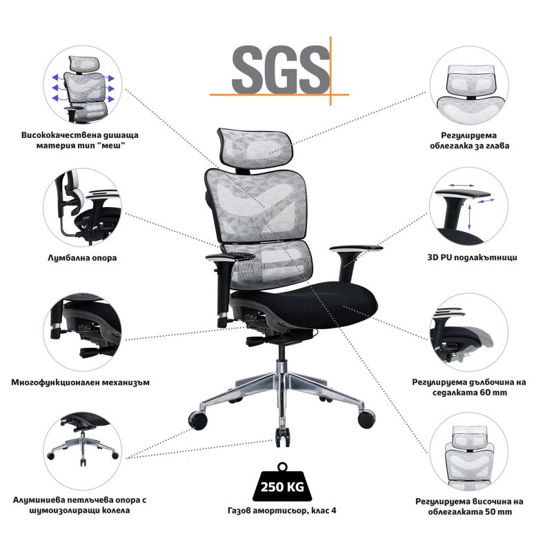 • 3D подлакътници и регулируема опора за глава осигуряват още повече удобство през дългите работни дни.