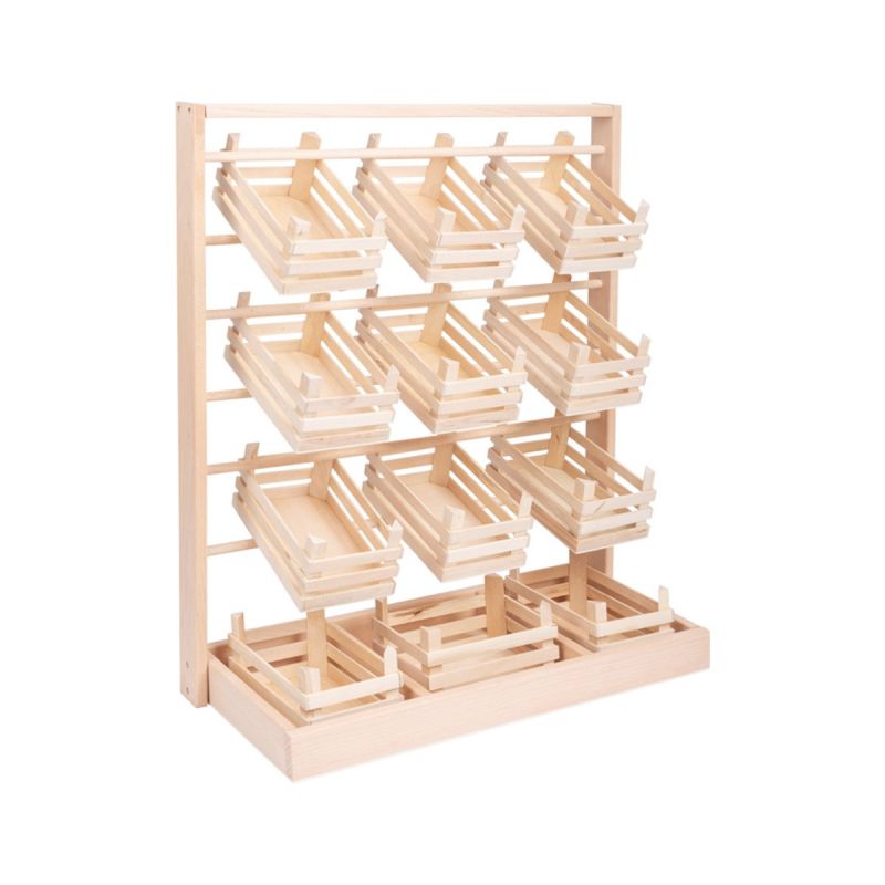 Дванадесетте включени дървени щайги могат да бъдат окачени поотделно на стойката или поставени в долното отделение.