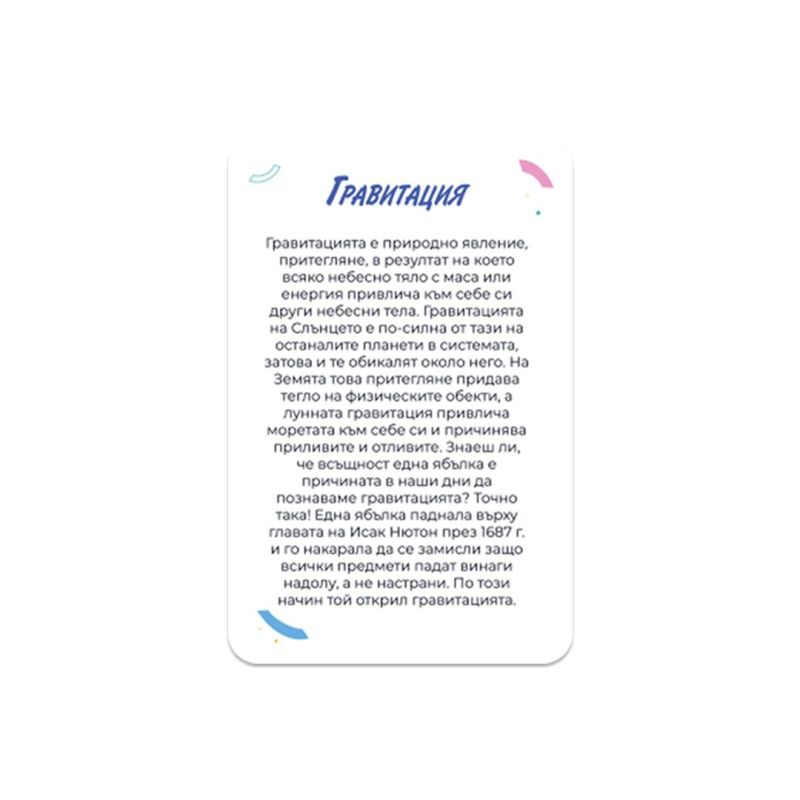 Картите са чудесен избор за деца над 3-годишна възраст. Освен че ще научат много интересни факти за Космоса, със сигурност ще се запалят и ще имат много добра предварително подготовка по физика и астрономия! От едната страна на картите ще откриете прекрасни изображения, които ще оставят траен спомен в съзнанието на малките ни приятели, а от другата се крие любопитна информация за космическия обект, явление или изобретение. Очакват ви интересни факти за планетите в Слънчевата система - от Меркурий до Плутон, както и за нашият спътник - Луната. Ще научите и за необятната галактика Млечен път, за явленията лунно затъмнение, комета, гравитация и черна дупка, както и за изумителни изобретения като совалка, телескоп, сателит и много други!