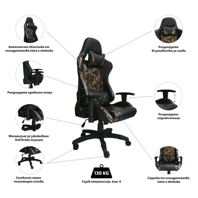 Геймърски стол RFG Top Game, екокожа, полиамидна основа, до 130 kg, цвят камуфлаж