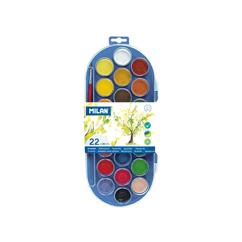 Milan Акварелни бои, 30 mm, 22 цвята, с включена четка